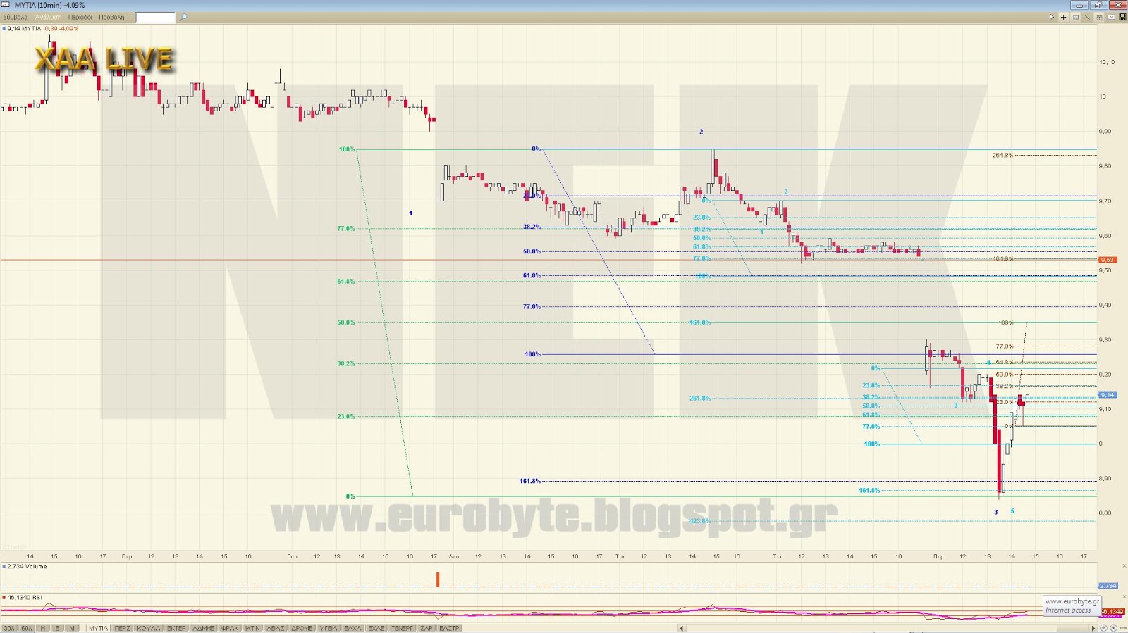 Συμπλήρωσε κύμα 3 μπλε με 3=161.8% του 1. Λείπει το 5 μπλε το οποίο θα ξεκινήσει είτε από το 9.23 είτε από το 9.35 στο 38 και 50% αντίστοιχα του πράσινου φίμπο όπου αναμένεται η λήξη του 4 αντίδρασης.
