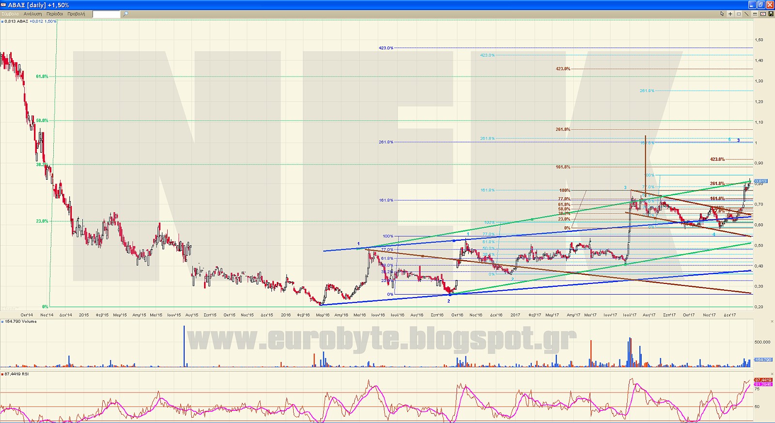 Θα έχουμε εκεί λήξη 5 γαλάζιου (εσωτερικού) και 3 εξωτερικού με ανλογίες που φαίνονται στο διάγραμμα. Εκεί αναμένεται 4 μπλε και το τελικό ανοδικό 5 με πιθανό τελικό στόχο τα 2 ευρώ.