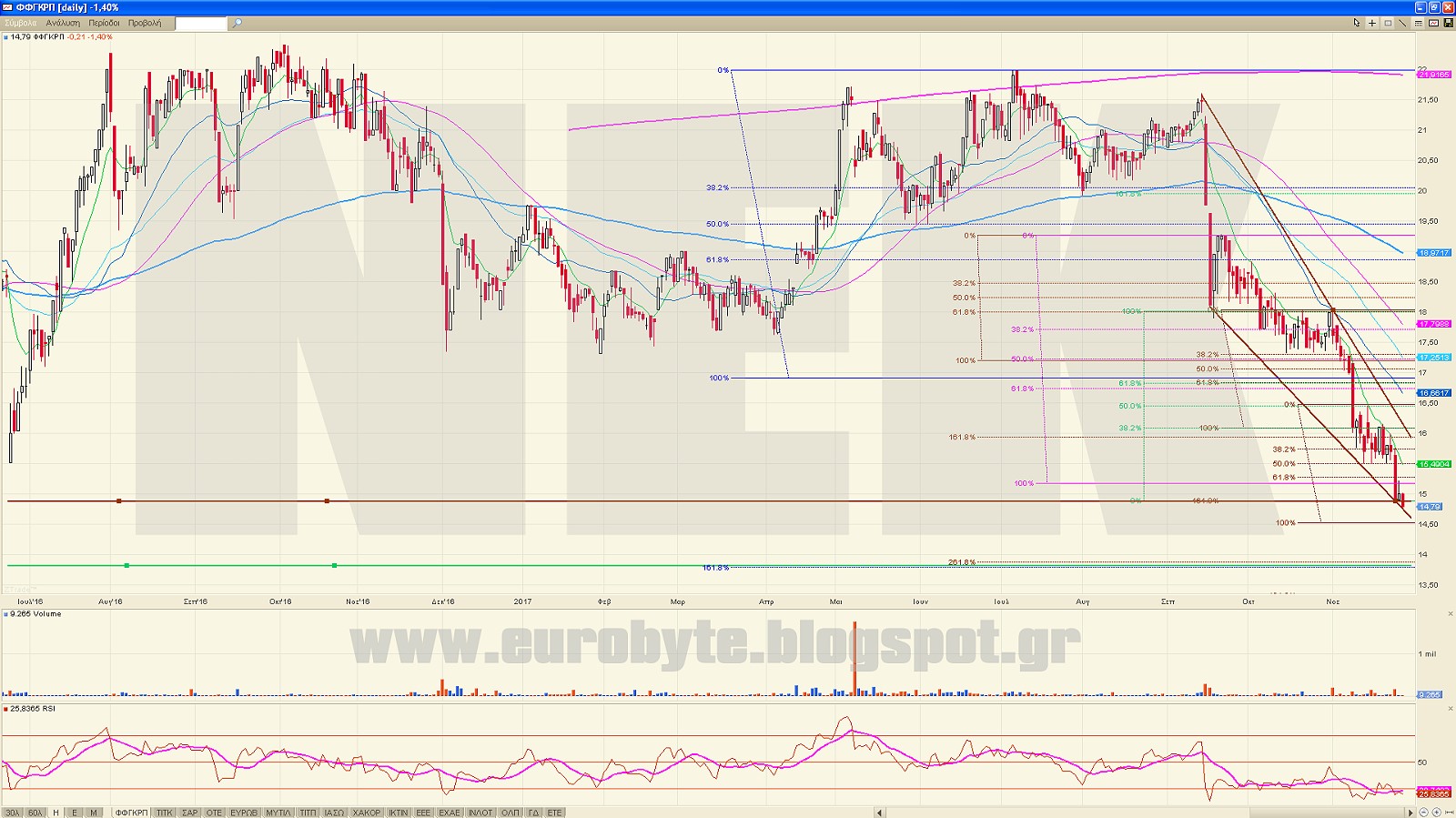 Αν δεν κρατήσει την μπλε οριζόντια γραμμή στο 9.30 (9.42 σε ημερήσιο) που αποτελεί το 61.8% του τελευταίου καθοδικού και το 61.8% του πρώτου καθοδικού καθώς και τη στήριξη 8.75, τότε είναι αρκετά πιθανό να κινηθεί προς τα προηγ. χαμηλά στα 3.10 όπου είναι και το 77% από την εξωτερική αναλογία. Πριν από αυτό τα 5 ευρώ είναι το 77% της εσωτερικής αναλογίας και άλλο ένα πιθανό σημείο για να σταθεί σε περίπτωση συνε΄χισης της πίεσης.